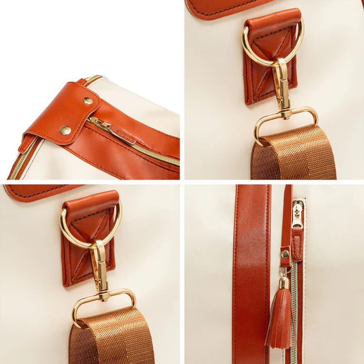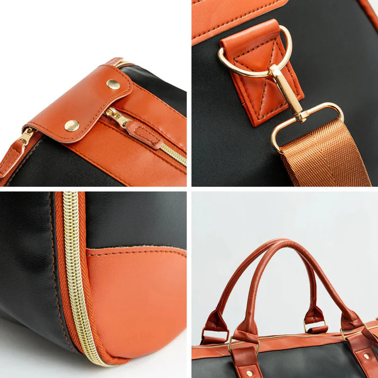 最大の特徴は、スーツやドレスを収納するガーメントケースが、そのままボストンバッグの側面に変形する画期的なデザインです。