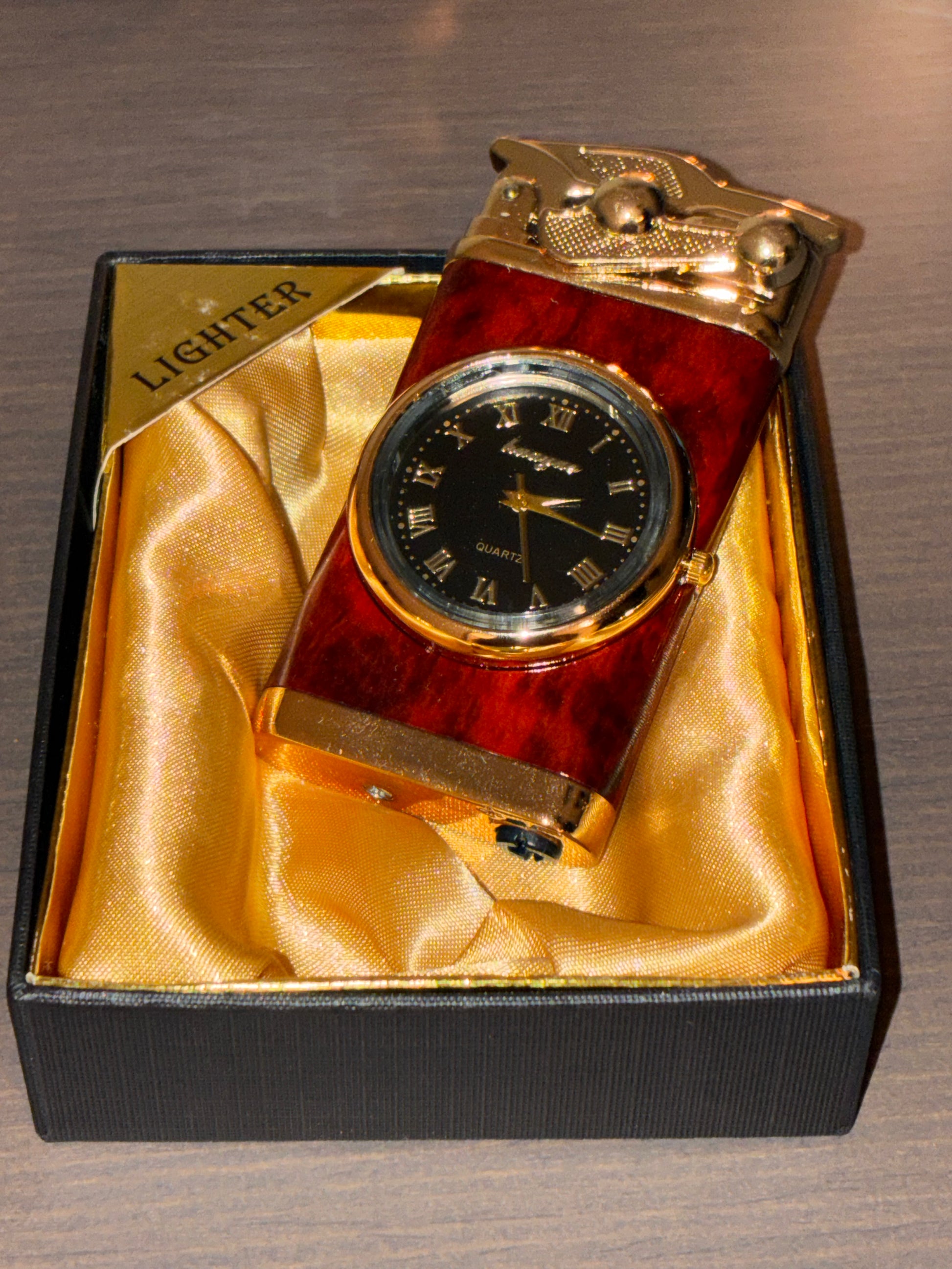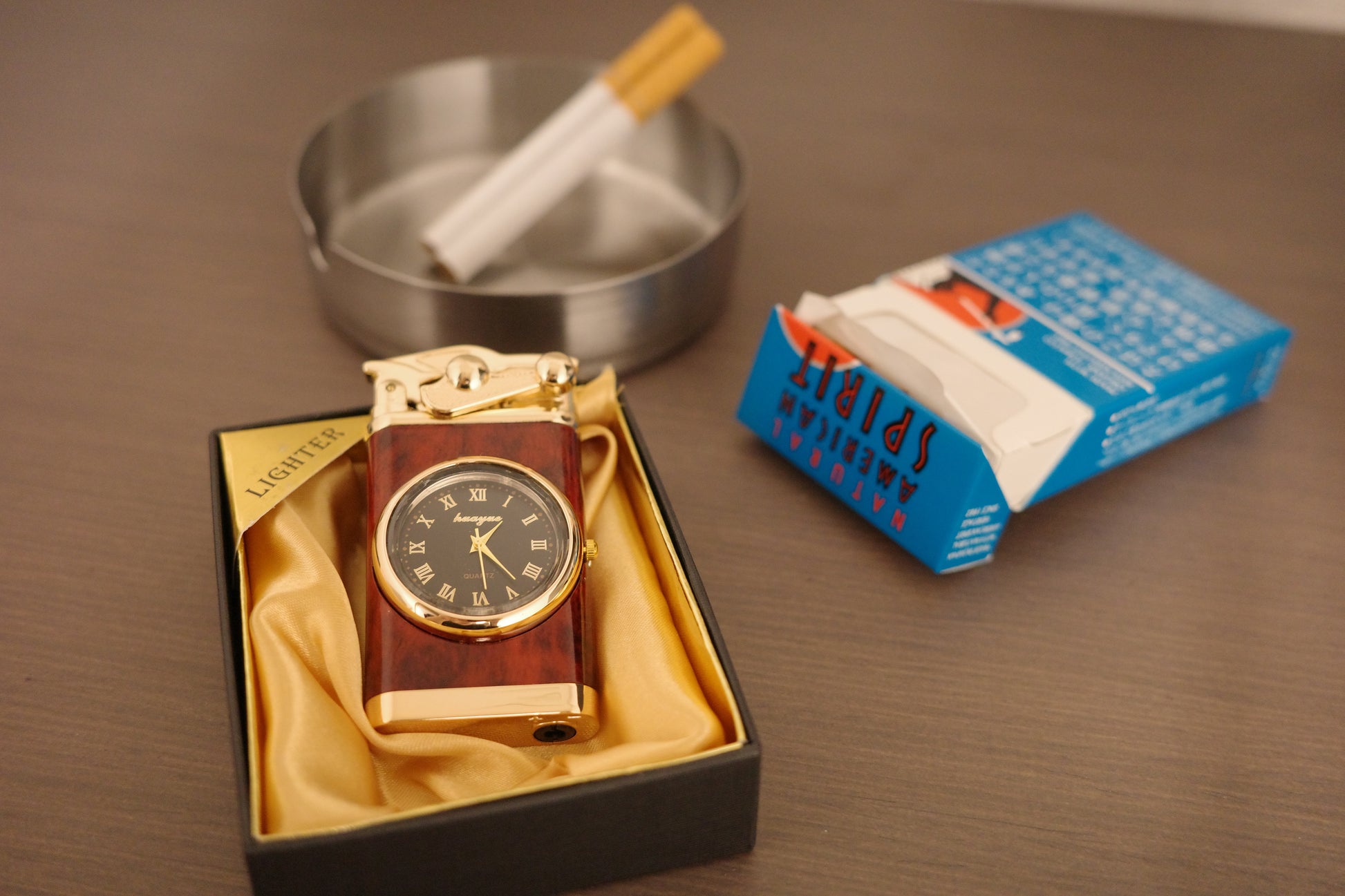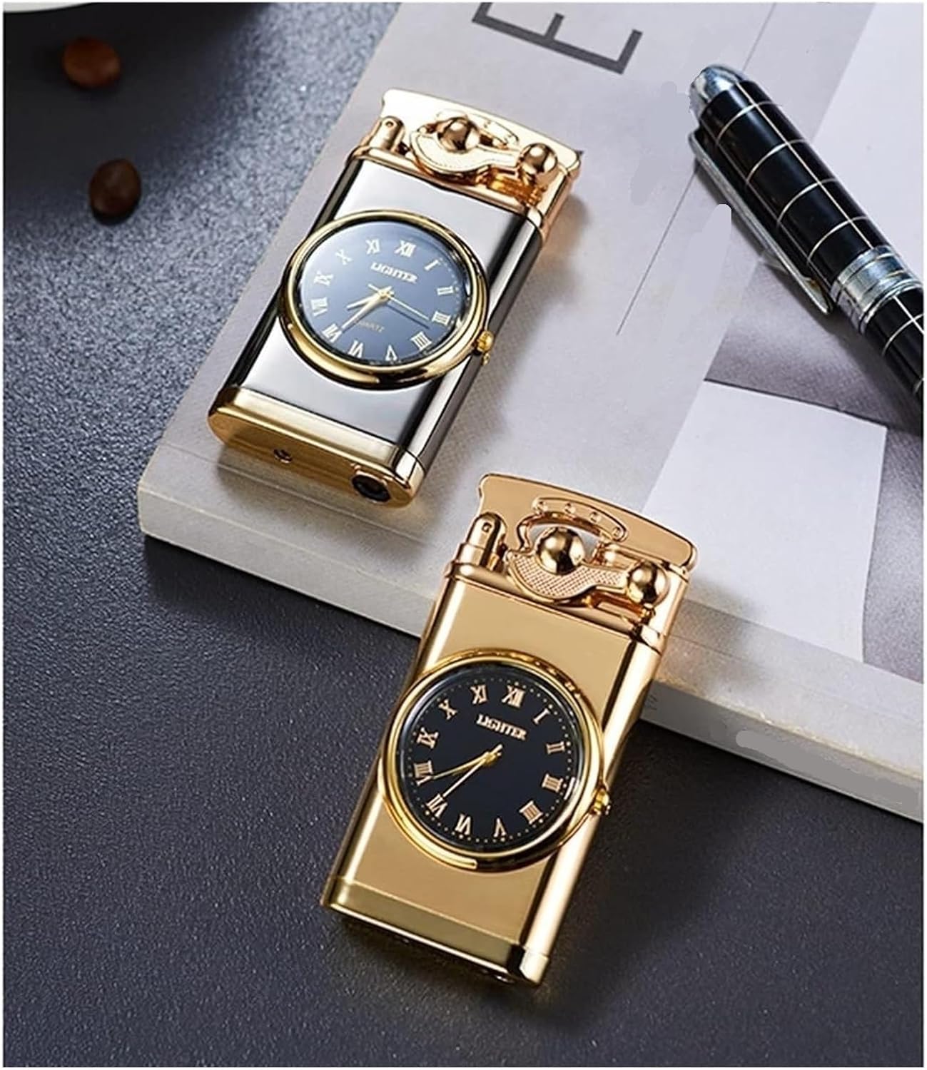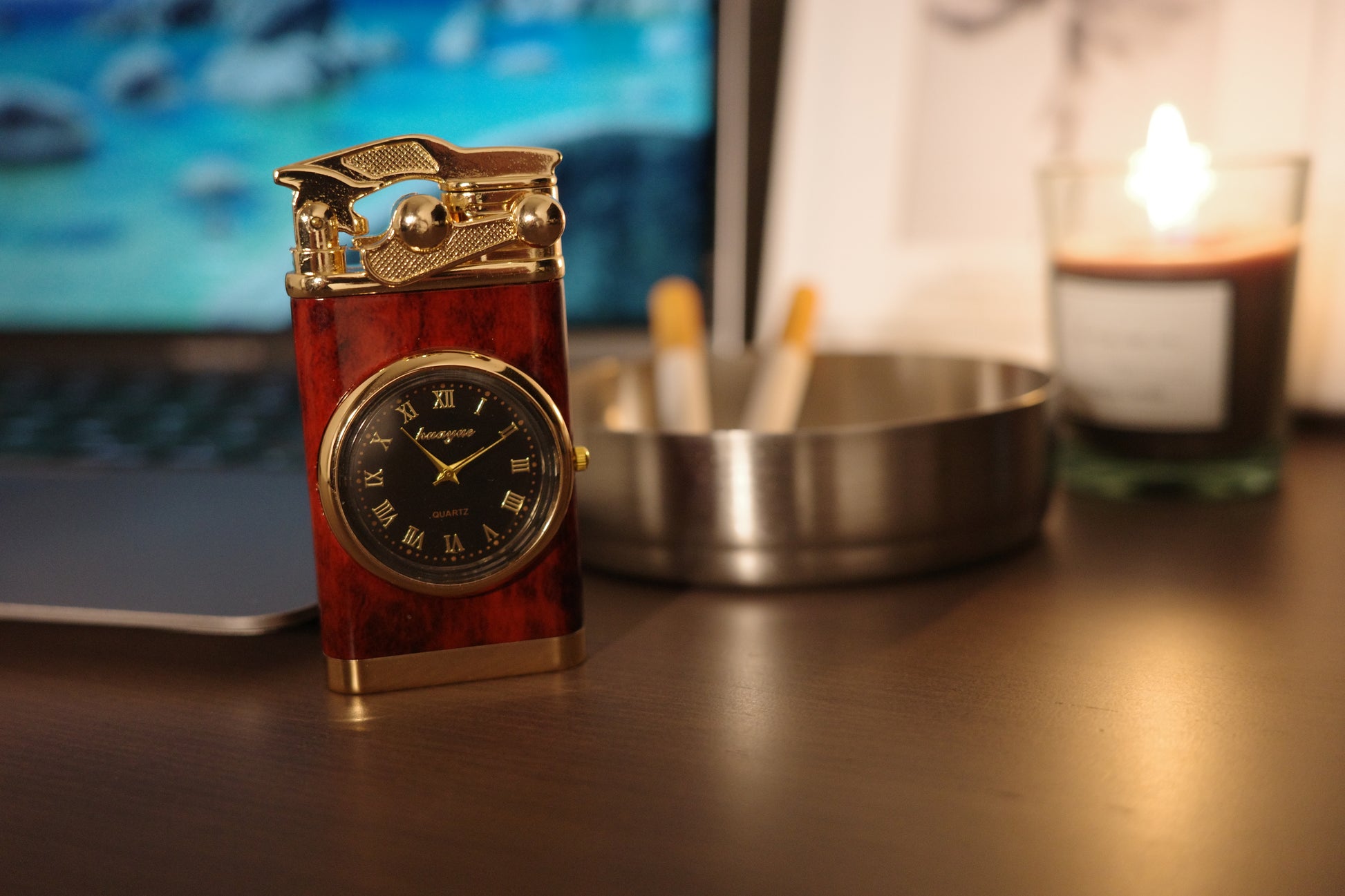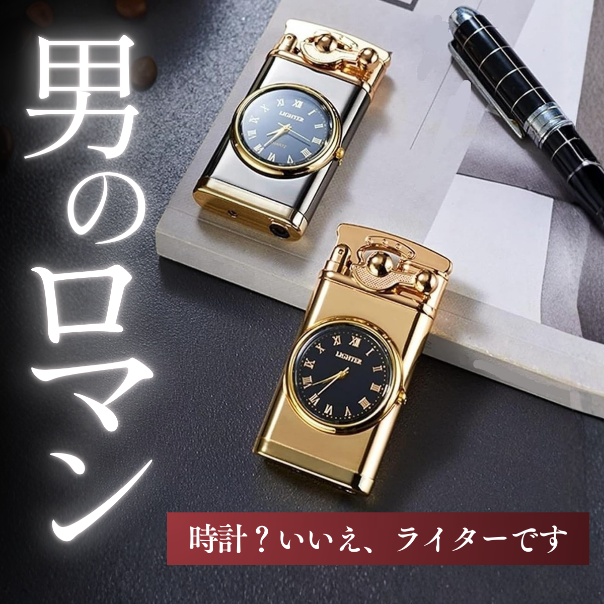 Whispenのライターは、文字盤が美しく埋め込まれた唯一無二のヴィンテージデザインです。メタル削り出しの重厚な質感と、精巧なアナログ時計の組み合わせは、見る者に「それは一体何だ?」という驚きを与えます。