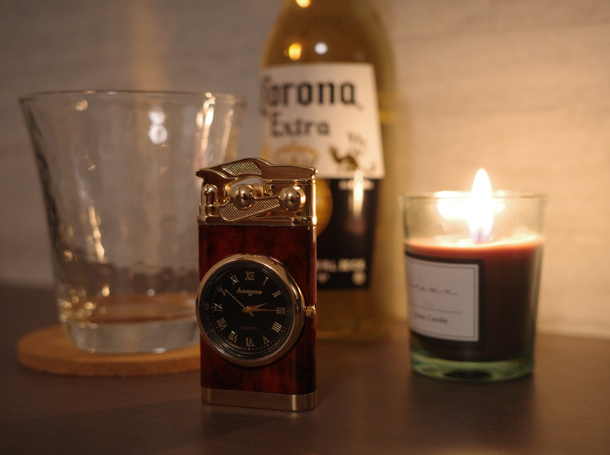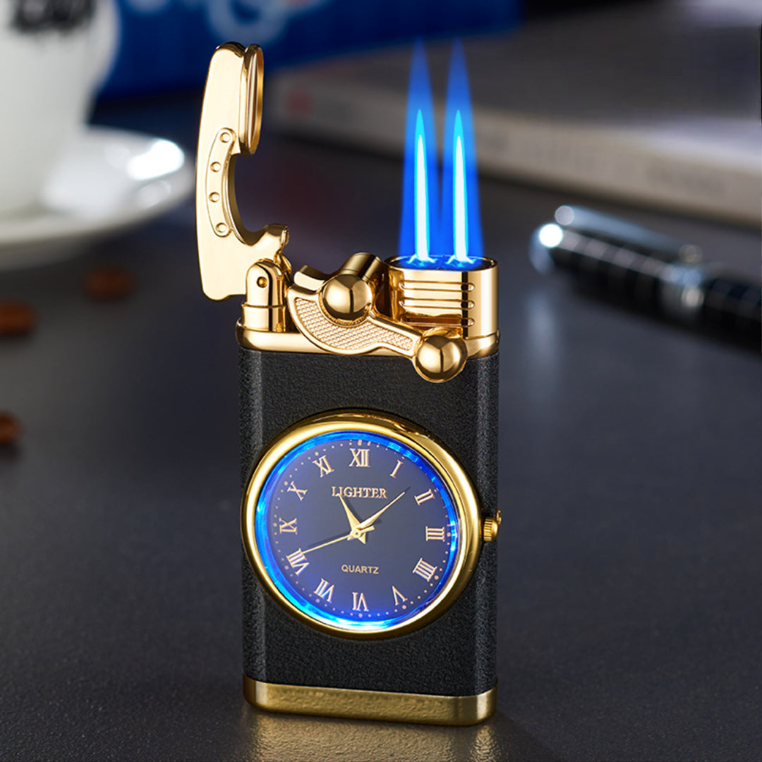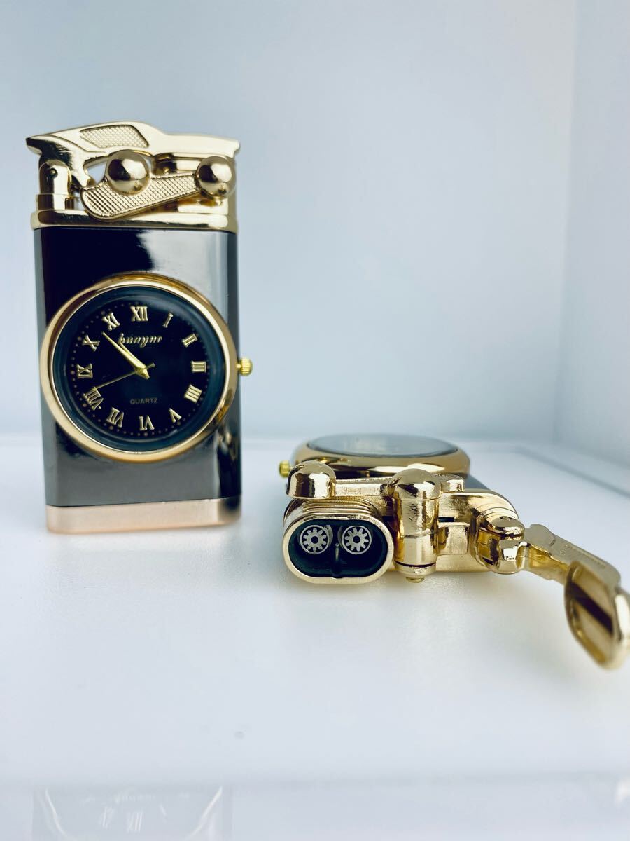 鈍く光るメタルの質感、精巧に時を刻むアナログ時計、そして闇を切り裂く力強い火炎。この3つが融合した姿は、まるで工芸品のような気品を放ちます。